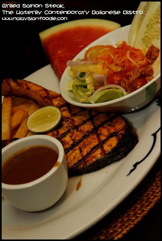 Grilled Salmon Steak – Marinated with authentic Balianese Lemongrass Marinate and Grilled to perfection , served with mixed Greens , a watermellon and waterlily brown gravy.