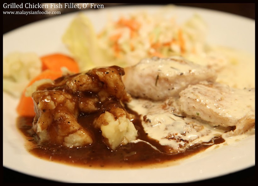 Grilled Chicken Fish Fillet is where the fish filet is grilled and served together with mashed potato, veggies and coleslaw. It is topped with Orlando Cheese Sauce.