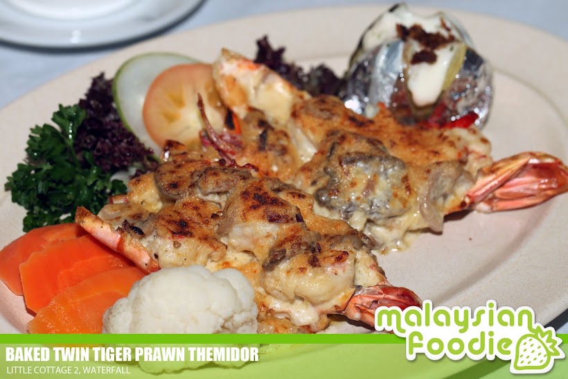 Baked Twin Tiger Prawn Themidor us a twin king sizwe tiger prawn meat cooked and removed from shell; and then tossed with bechamel sauce and wholesomey baked with cheese topping and served with baked potatos and french vegetables.