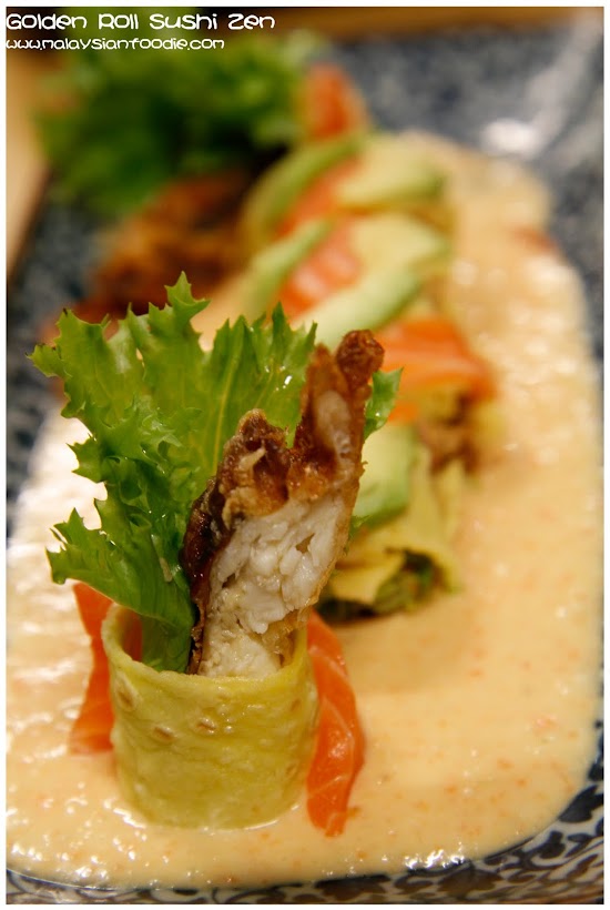 Golden Roll- Smoked salmon, avocado & cucumber wrapped in tempura flakes and served with thick and slightly spicy mayonnaise sauce.