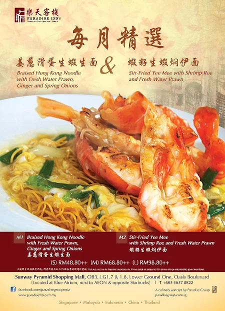 Paradise Inn is proud to present golden Stir-Fried Yee Mee with Shrimp Roe and Fresh Water Prawns, drizzled with liberal portions of mouth-watering egg sauce for a scrumptious meal. With top quality ingredients and expert preparation, this dish is sure to become your favourite!