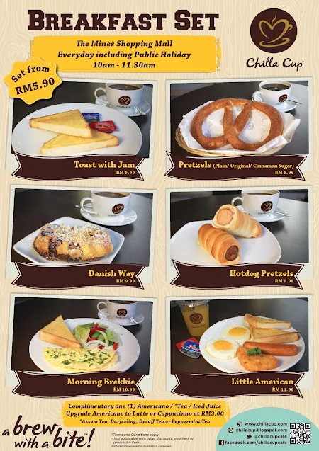 BREAKFAST SET PROMO AT CHILLA CUP, THE MINES SHOPPING CENTRE May 23, 2013 by StrawberrY Gal The Mines Breakfast Set Time : 10am – 11.30am Venue : The Mines Shopping Mall Promotion starts on 24 May 2013, Friday