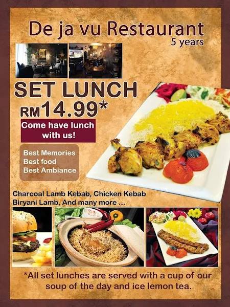 SPECIAL LUNCH PROMOTION AT DE JA VU RESTAURANT September 29, 2013 by StrawberrY Gal De ja vu special set lunch promotion @ RM14.99 Contact: 104 & 105, Dataran Jelatek, Jalan Jelatek, Kuala Lumpur 54200, Malaysia Tel : +603 – 4253 2101 Website: http://dejavukl.com/ Operating Hours: Daily : 1.00pm – 1.00am