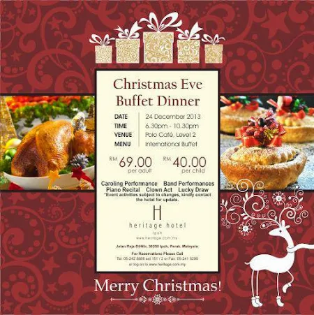 CHRISTMAS EVE BUFFET DINNER PROMOTION AT HERITAGE HOTEL IPOH November 25, 2013 by StrawberrY Gal Address Jalan Raja Di Hilir, 30350 Ipoh, Malaysia Phones05-242 8888 Website: http://www.heritage.com.my Facebook : http://facebook.com/ipoh.heritage
