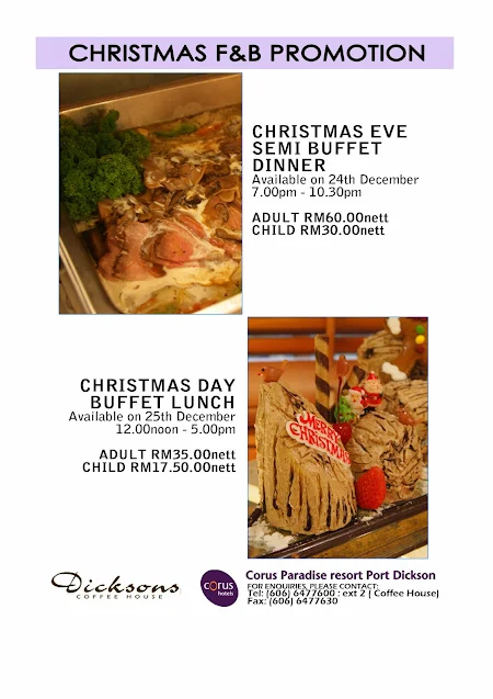 CHRISTMAS PROMOTION AT DICKSONS COFFEE HOUSE, CORUS PARADISE RESORT PORT DICKSON December 6, 2013 by StrawberrY Gal Dickson Coffee House Corus Paradise Resort Port Dickson 3.5km Jalan Pantai, 71000 Port Dickson, Negeri Sembilan Darul Khusus 71000 Port Dickson Always open Phone06-647 7600 Email[email protected] Websitehttp://www.corusparadisepd.com/