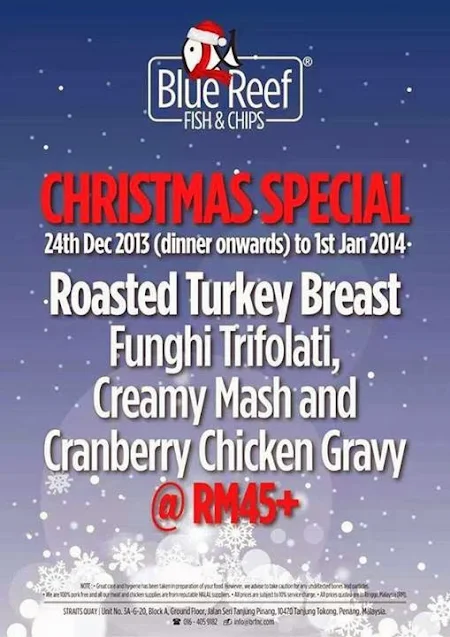 CHRISTMAS SPECIAL AT BLUE REEF FISH & CHIPS December 24, 2013 by StrawberrY Gal Christmas Special available from tonight onwards! Merry Christmas! Address Straits Quay 10470 Penang, Malaysia Phone016-405 9182