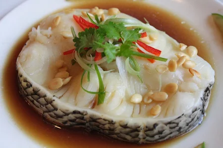 Steamed Cod Fish with Watermelon Seed in Soya Sauce and Chinese Parsley
