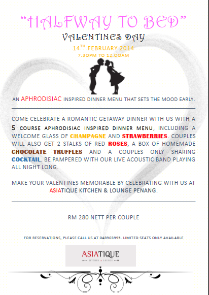VALENTINE PROMOTION ASIATIQUE January 23, 2014 by StrawberrY Gal Restaurant Address: C-G-3 Vantage Desiran, Asiatique Jalan Desiran Tanjung, 10470 Tanjung Tokong, Penang, Malaysia