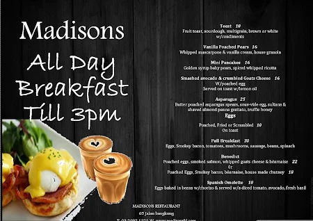 ALL DAY BREAKFAST TILL 3PM AT MADISSONS February 21, 2014 by StrawberrY Gal Madisons Restaurant, Jalan Bangkung, Bangsar, Kuala Lumpur. Tel: 03-2092-1222 Open for lunch and dinner, except Sundays.