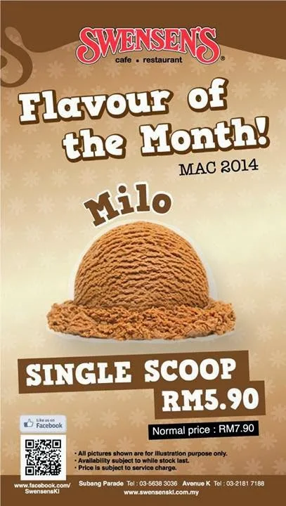 SWENSENS FLAVOUR OF THE MONTH: MARCH 2014 February 28, 2014 by StrawberrY Gal Swensen’s is offering their flavour of the month – Milo for only RM5.90 per single scoop (usual price: RM7.90). LocationSubang Parade & Avenue K