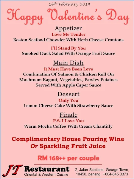 VALENTINE DAY PROMOTION AT JT RESTAURANT ORIENTAL & WESTERN CUISINE