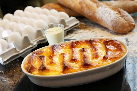 renowned English Bread and Butter Pudding with Vanilla Sauce is softly immersed with butter fragrance, serves alongside with vanilla sauce made from fresh genuine vanilla seed.