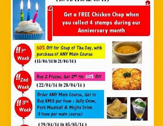 For 4 weeks enjoy special promotion at Retro's Kitchen. Date : 15th Apr - 12th May 2014 Week 1 @ 50% Off for soup, when you buy main course Week 2 @ 50% Off on second pizza Week 3 @ RM3 per item, when you buy main course Week 4 @ 50% Off Salad, when you buy main course Do contact Retro Kitchen for reservation and more information. Contact: Jalan SS2/61, 47300 … [Read more...] about 4 WEEKS SPECIAL PROMO AT RETRO KITCHEN