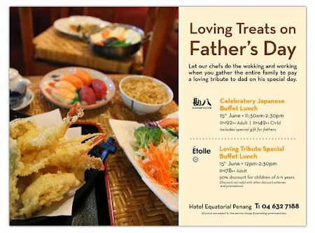 LOVING TREATS ON FATHER’S DAY AT EQUATORIAL PENANG June 10, 2014 by StrawberrY Gal A loving treats on Father’s Day at Kampachi and Etoile Hotel Equatorial Penang Jalan Bukit Jambul, 11900 Penang, Pulau Pinang, Malaysia +60 4-632 7000