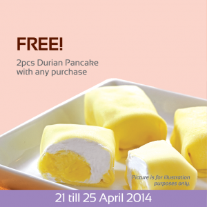 Present Coupon from Sweet Chat Cafe Facebook to enjoy FREE 2 pcs of Durian Pancakes with any purchase from 21 till 25 April 2014. Valid for dine-in only. Date: 21 till 25 April 2014 Venue: Sweet Chat Cafe Mid Valley … [Read more...] about FREE 2 PCS DURIAN PANCAKE WITH ANY PURCHASE AT SWEET CHAT