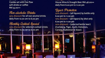 Enjoy a special Buy 1 Get 1 Free at Blue Chip Lounge during Happy Hour. Time : 5.30PM - 8.30PM daily Do contact Blue Chip Lounge for reservation and more information. Swiss-Garden Hotel KL, 117, Jalan Pudu, 55100 Kuala Lumpur Tel : +603 - 2141 3333 Fax : +603 - 2141 5555 Website: http://www.swissgarden.com … [Read more...] about HAPPY HOUR @ BLUE CHIP LOUNGE, SWISS GARDEN HOTEL KL