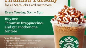 Enjoy Buy 1 FREE 1 Starbucks Tiramisu Frappuccino on every Tuesday from 5pm to 7pm! Offer valid for all Starbucks Card customers! Date: October 2014 Time: 5pm – 7pm Venue: Starbucks Coffee stores nationwide … [Read more...] about TIRAMISU TUESDAY @ STARBUCKS