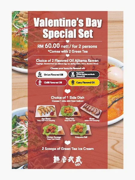 VALENTINE’S DAY SPECIAL SET @ MENYA MUSASHI February 13, 2015 by StrawberrY Gal Celebrate the “Love Month” In Menya Musashi 1Utama this coming February 14,2015. Love is in the Air on Saturday!! Avail Our Special Set Menu for 2pax @ RM 60nett Location : Menya Musashi 1 Utama