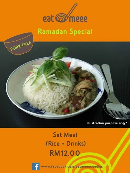 RAMADHAN SPECIAL @ EAT.MEEE, SUNWAY PYRAMID June 23, 2015 by StrawberrY Gal EatMeee is offering their Set Meal (Rice + Drinks) for only RM12. Pork-free. For a limited time only. Available at: EatMeee – Sunway Pyramid