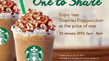 Enjoy Buy 1 Free 1 Starbucks Tiramisu Frappuccino at the price of one tomorrow! Offer valid at ALL Starbucks Coffee outlets nationwide on 22nd January 2015 from 5 pm - 8 pm Terms & Conditions: Valid only on 22 January 2015. Available at all Starbucks stores except all airport stores and Genting Highlands stores. Complimentary beverage must be of equal or lesser … [Read more...] about BUY 1 FREE 1 @ STARBUCKS