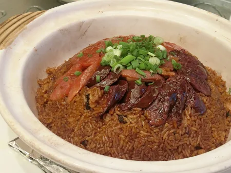 Steamed Rice with Fried Yam, Preserved Sliced Duck and Sausage in Claypot