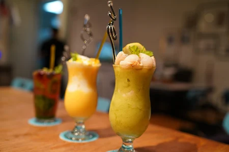 Mango Fiasco – Fresh Blended Mangoes with Milk topped with the Mango cubes, Whipped Cream, Basil Seeds, Mint Leaf