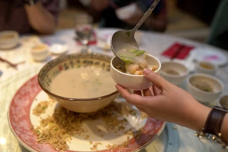Braised Sangkan Oyster Balls, Sliced Balls, Sliced Shell Abalone, Hericium Mushrooms, Sea Moss and Seasonal Vegetables