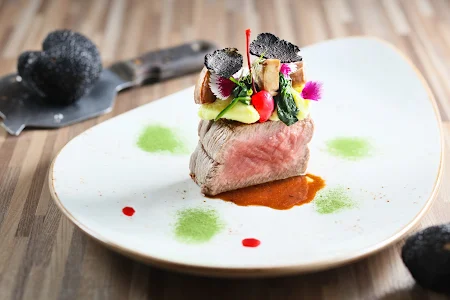 Black Angus Beef Tenderloin with Pan-seared Duck Liver, Cherry and Black Truffle Sauce is a dish combining lean beef tenderloin with rich duck liver, alongside cherry and black truffle sauce, for a balanced flavor profile unlike any other.