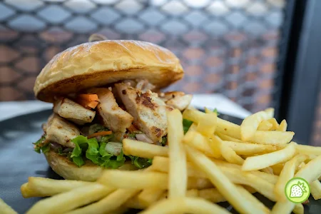 Soft Brioche Buns with the Thai Shredded Chicken, Thai Salad, sliced japanese cucumber topped with the crunchy almond nibs)served with french fries. It is perfectly good and delicious where every bites.