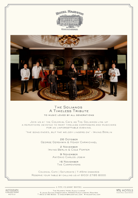 Beginning this Saturday, 26 October and for 3 consecutive Saturdays, we are introducing A Timeless Tribute by The Solianos where they have lined up a series of repertoire devoted to many timeless composers and musicians for unforgettable evenings at Colonial Cafe from 7.45pm onwards.
