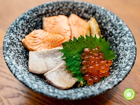 A hearty dish completes with flavours and the umami. You can enjoy the perfectly grilled sashimi ( Toro, Salmon & Engawa) which is beautiful laid on the bed of sushi rice. It is then topped with the bubbly ikura which brings the umami taste to it.