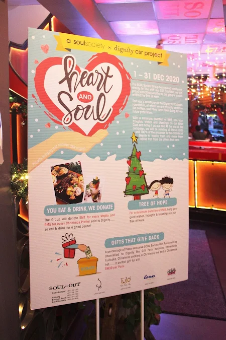 Customers can join in the fundraising fun by just dining at any SOUL Society outlet. The main drivers to raise the funds are through purchases of the various delicious Christmas Platters available in each restaurant, where RM5 will be donated for each platter sold. Additionally, RM1 contributions from any regular size Mojitos from the menu will also go to the Dignity Fund. Patrons who want to do more can show their support for the campaign by buying wishing cards at a RM5 minimum donation and decorating the Christmas trees at any of these outlets or dropping a donation in the Dignity for Children donation boxes that have already been set-up at six Soul Society outlets which include WIP, Tujo, Hubba, SOULed OUT Ampang, SOULed OUT Bangsar South, and SOULed OUT Kuala Lumpur in Desa Sri Hartamas.