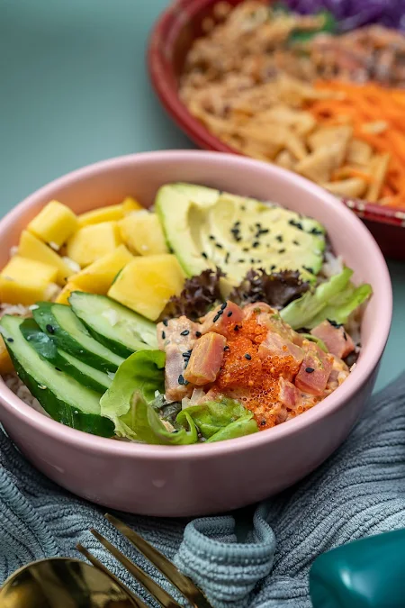 The Ahi Tuna Poke Bowl is not just healthy but they are really appetizing The poke bowl complete comes with the chunks of tuna, together with the cubes of mango, and avocado. They are pretty healthy and every mouthful is sinfully good !