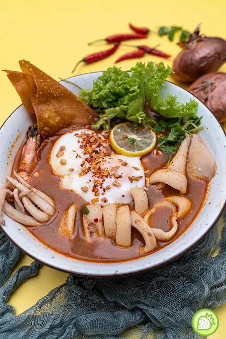 The superbly delicious tomyam noodles comes with the squid, prawns, and cheese with it. They are topped with 2 onsen egg to enhance the creaminess of the dish. Not too spicy but they are just perfect. When you purchase the takeaway and plan to eat them later, this is a good choice where you just need to heat uo the soup and add in the noodles and ingredients to warm them. Superb!