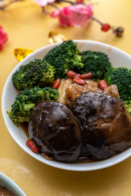 Braised black mushroom with fried fish maw and broccoli