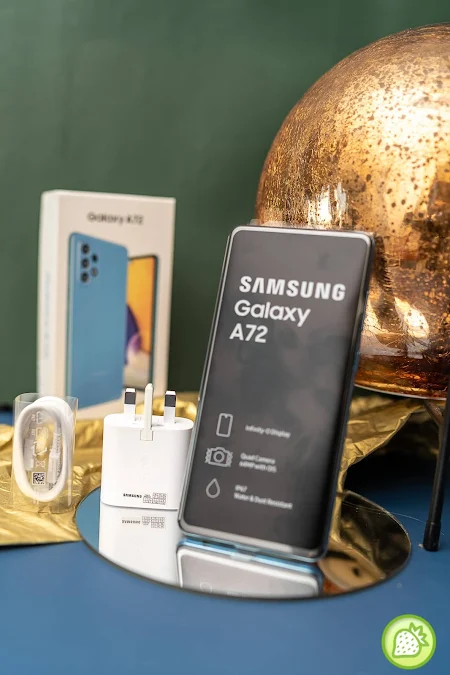 The Galaxy A72 complete with the Quick Start Guide, Warranty Card, Ejection Pin, and a Charging Cable, and a Super Fast Charging Adapter too.