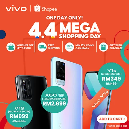 vivo Malaysia is offering exciting discounts of up to RM 700 on vivo Malaysia’s Official Flagship Store on Shopee, in conjunction with Shopee 4.4 Mega Shopping Day, happening on 4th April. Customers can purchase a vivo smartphone from as low as RM 359 with free shipping and redeem gifts (worth up to RM 656) and discount vouchers (worth up to RM 70).