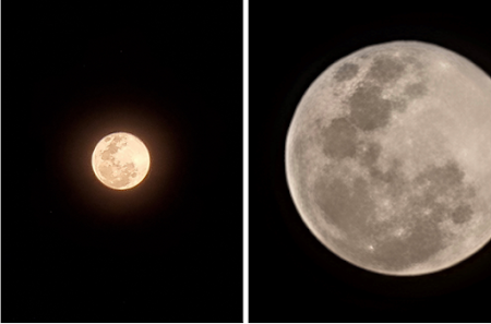 While the 30x zoom can snap a clear picture of the bright moon (left), max out the zoom to make the most of the Space Zoom function (right)
