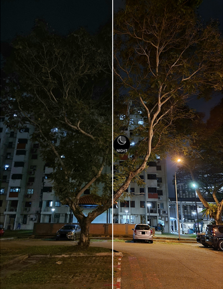 (Images taken on Samsung Galaxy S21 Ultra 5G. Left: Default camera, Right: Night Mode)