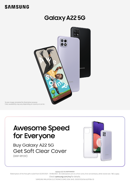Comes with a dash of awesome pastel colors captures attention and adds a flourish of beauty to your everyday style – Violet, Gray, and Mint. The Galaxy A22 5G is available at Recommended Retail Price of RM999. From 2 July until 31 August 2021, when you purchase a Galaxy A22 5G you will receive a free Soft Clear Cover worth RM39 . Get your hands on it while stocks last!