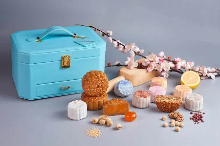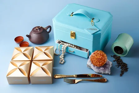 Le Méridien’s official brand colour –the MidCentury Blue. Simply unclasp the heavy- duty gold clasp to unlock our meticulously handcrafted Mid-Autumn Treasures.
