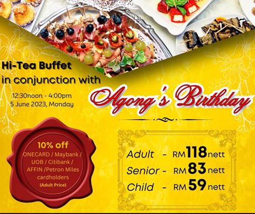 Hi-Tea Buffet on Agong’s Birthday Monday, 5 June 2023 12:30noon – 4pm RM 118 nett (adult) RM 83 nett (senior citizen) RM 59 nett (child) 10% off ONECARD / Maybank / UOB / Citibank / AFFIN / Petron Miles cardholders (adult price) Dine with us: Tel: 03 7681 7666 WhatsApp: 016 302 7838 Email: [email protected] More details: … [Read more...] about Hi-Tea Buffet on Agong’s Birthday at AVANTÉ Hotel