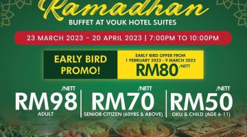 + ✨MARHABAN YA RAMADHAN ✨ Are you guys ready for Meriahnya Ramadhan Buffet at Vouk Hotel & Suites Penang. Set your date. Ramadhan is coming, a perfect time to gather with friends and relatives. Grab early bird price for only RM80.00/nett from now till 9 March 2023. Meriahnya Ramadhan Buffet will start on 23 March 2023 - 20 April 2023. CALL US NOW FOR MORE … [Read more...] about Ramadhan Promotion @ Vouk Hotel Suites Penang