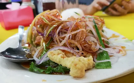 The chicken is beautifully deep fried till perfection leaving you with crunchy and crispy bites. It is then topped with the Thai Sauce with thinly sliced onions and cucumber on top.