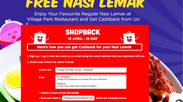 From 15 April 2016 to 15 May 2016, ShopBack Malaysia will not only be rewarding people with cash for shopping online, but also for eating Nasi Lemak - a Cashback treat that most surveyed shoppers wished for. Public can get up to 100% Cashback when they feast on a Nasi Lemak Ayam Goreng (Nasi Lemak with fried chicken) at Village Park Restaurant, the famous Nasi Lemak eatery in … [Read more...] about SHOPBACK PARTNERS VILLAGE PARK RESTAURANT TO TREAT MALAYSIANS SCRUMPTIOUS NASI LEMAK