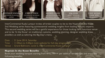 Following a successful launch of the ultra-exclusive ‘Nuptials In the Know’ Wedding Series, premium luxury hotel InterContinental Kuala Lumpur is unveiling the second series on June 21, 2014 connecting bridal couples-to-be with a lineup of new experts in the wedding industry. InterContinental Kuala Lumpur’s Nuptials In the Know 2nd Wedding series will be held at the newly … [Read more...] about “CULTURE, EXPERTISE & CUISINE”: InterContinental Kuala Lumpur Launches 2nd Series of the Ultra-Exclusive ‘Nuptials In the Know’ Wedding Series with New InterContinental Wedding Guru and More Benefits