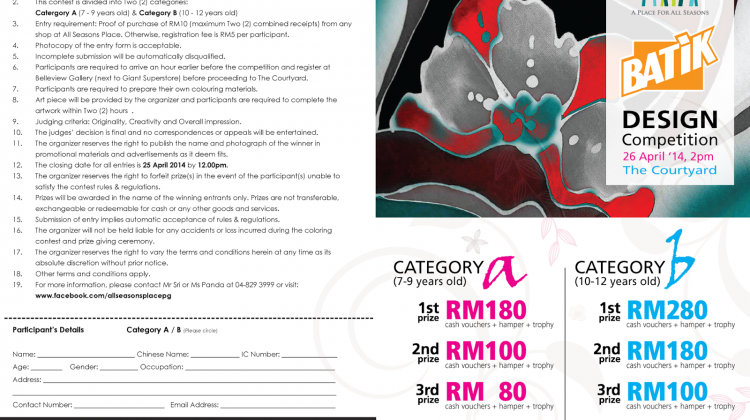Batik design competition, for children aged 7 to 12 years old, in support of Visit Malaysia Year 2014, will be organized by All Seasons Place at The Courtyard. The winning design, in two different categories, category A (7-9 years old) and category B (10-12 years old), will have a chance to win to a share of prizes worth RM1,700. In order to enter the competition, … [Read more...] about BATIK DESIGN COMPETITION AT ALL SEASONS PLACE, PENANG