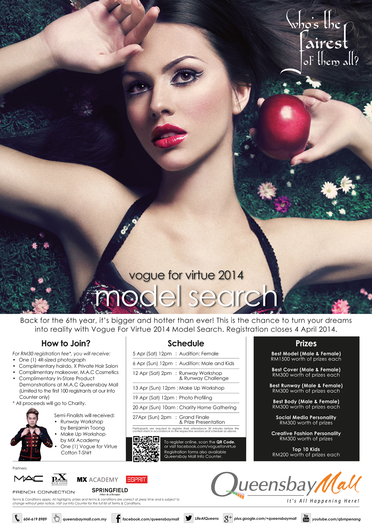 Back for the 6th year, it’s bigger and hotter than ever! This is the chance to turn your dreams into reality with Vogue For Virtue 2014 Model Search. Registration closes 4 April 2014. To register online, visit http://queensbaymallmalaysia.com/vogueforvirtue. For more details and registration, visit Queensbay Mall’s Info Counter, GF Centre Zone. … [Read more...] about VOGUE FOR VIRTUE 2014 MODEL SEARCH