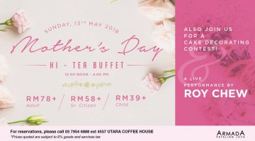Spoil mom with a wide range of mouth watering dishes from our Hi-Tea Buffet! Gather your clan and surprise mom @ Utara Coffee House for Mother's Day Celebration! Call now to make your reservations! … [Read more...] about Mother’s Day Hi – Tea Buffet @ Armada Petaling Jaya