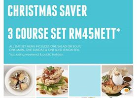 Christmas Saver 3 Course Set RM45 Nett. Set includes 1 Soup or Salad, 1 Main, 1 Sundae & Iced Lemon Tea. Valid from 1st - 30th December 2016, All-day (Excluding public holiday & weekends). Available at the following outlets:Bangsar Village 2 Tel: +603 2287 1554Mid Valley Megamall Tel: +603 2287 5770St Mary Place Tel: +603 2022 1983 Sunway Pyramid Tel: +603 5631 8181 … [Read more...] about Christmas Saver with Delicious